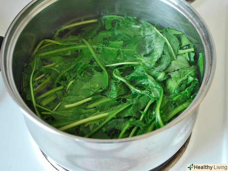 Закип'ятіть велику каструлю води.щоб прибрати трохи гіркоти з листя кульбаби, їх потрібно зварити у воді.[1] наповніть велику каструлю водою, додайте чайну ложку (5 г) солі і доведіть до кипіння.