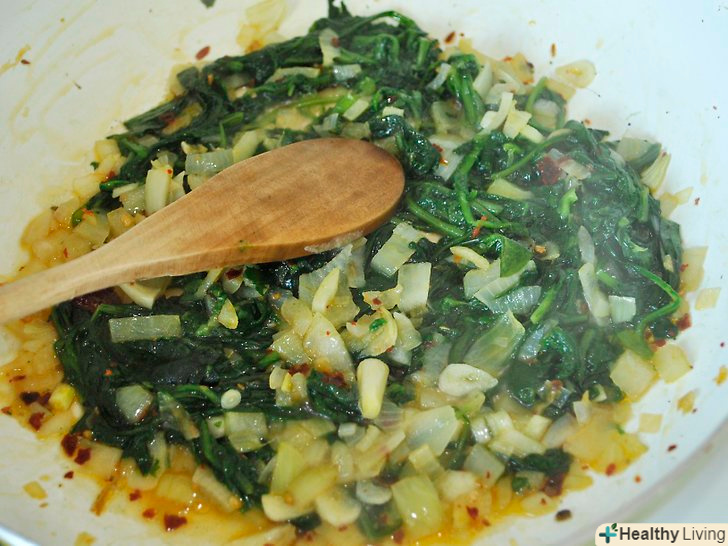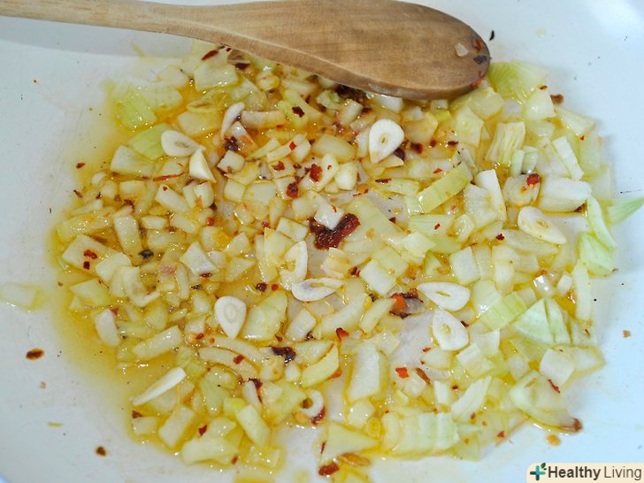 Пасеруйте решту інгредієнтів.візьміть велику сковороду, налийте в неї оливкову олію і поставте на середній вогонь. Коли сковорода стане гарячою, додайте цибулю і пластівці червоного перцю чилі. Пасеруйте протягом п'яти хвилин, поки цибуля не стане м'яким.[3]- Коли цибуля буде готова, додайте часник і пасеруйте ще 30 секунд.