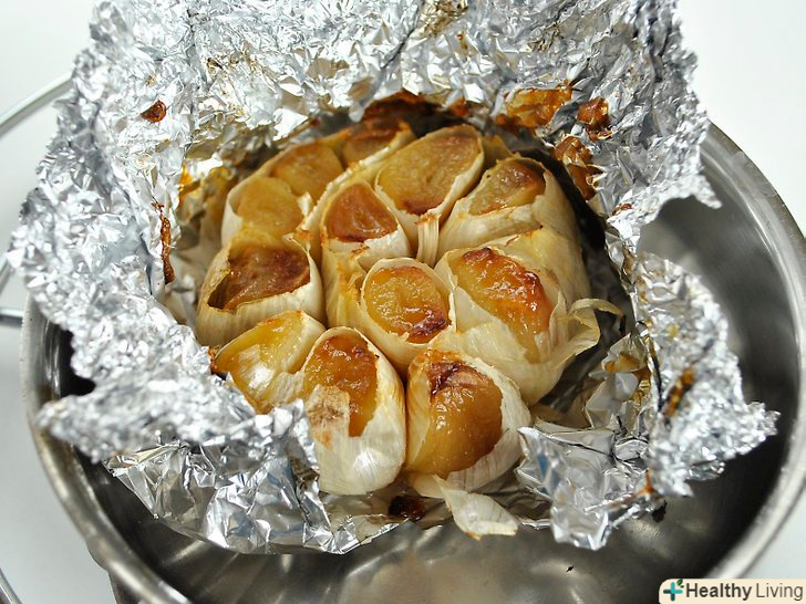 - Помістіть часник на алюмінієву фольгу і полийте головку часнику столовою ложкою (15 мл) рослинного масла. Загорніть часник у фольгу, покладіть на деко або в жароміцну тарілку і запікайте 35-55 хвилин.