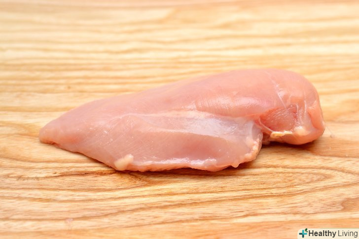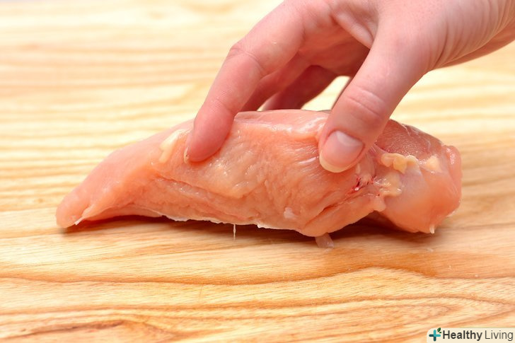 Покладіть на обробну дошку відносно тонкий шматок м'яса, наприклад, стейк, курячу грудку або скибочку корейки.