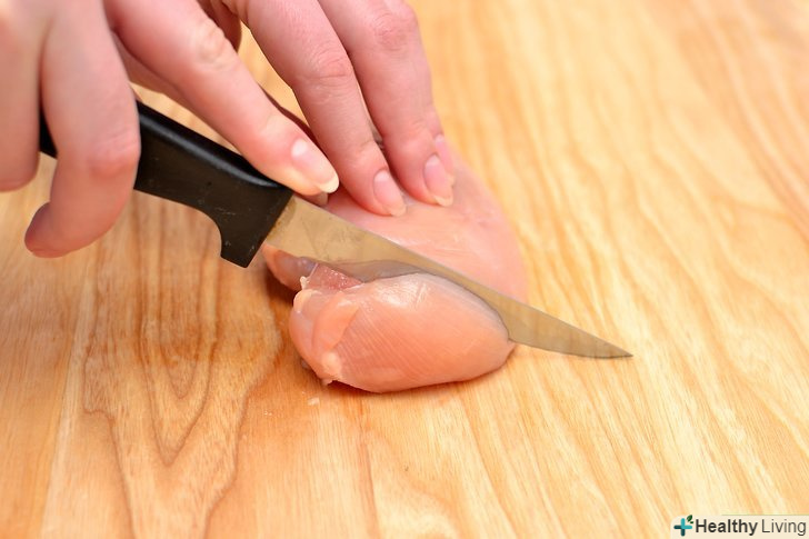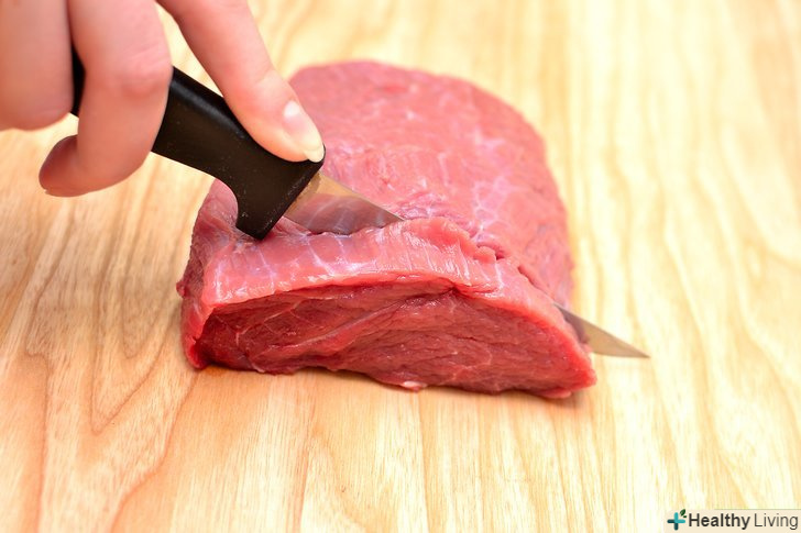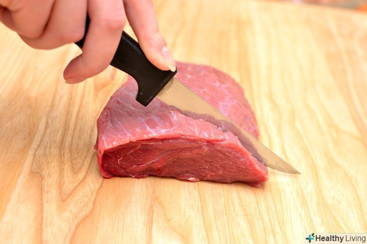 Поставте лезо ножа під 45-градусним кутом по відношенню до сторони м'яса, яка найбільш далека від вас.ви будете нарізати м'ясо під кутом вниз поперек волокон.