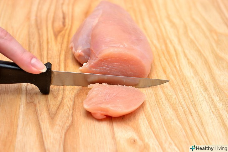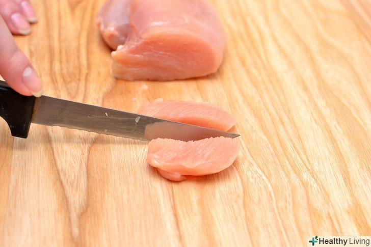 Натисніть ніж назад через м'ясо, застосовуючи тиск, спрямований вниз.у вас будуть короткі брусочки м'яса, які скоротять час приготування і дадуть більш ніжні шматочки приготованого м'яса.