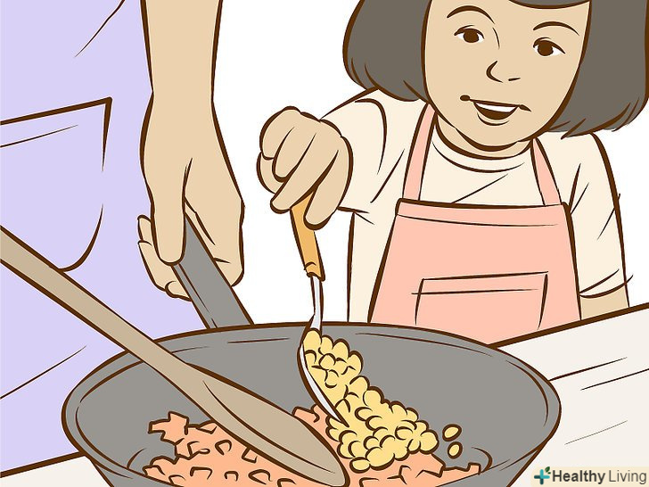 Готуйте разом з сім'єю.незалежно від рецепту, який ви хочете втілити в життя, покличте членів сім'ї на допомогу. Запросіть маму чи тата, брата чи сестру. Можете навіть попросити допомоги у бабусі, дідуся, тітки або дядька. Таким чином можна весело провести на кухні час в колі сім'ї.[4]- Щоб закликати членів сім'ї готувати разом з вами, просто скажіть: "Я збираюся приготувати корисну закуску. Чи не бажаєте приєднатися до мене і допомогти?”
