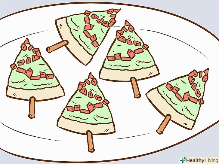 Зробіть закуску у вигляді святкової ялинки.розріжте лаваш на вісім трикутників. Застроміть тонку соломку в середину кожного шматочка лаваша. Соломка виступить в ролі стовбура дерева.[5]- Розмажте трохи гуакамоле на поверхні лаваша, щоб зробити його зеленим.