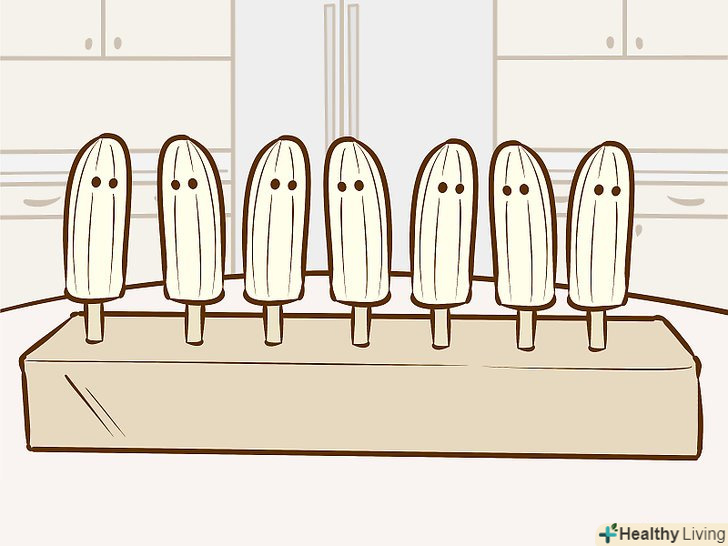 Приготуйте моторошного виду закуску в стилі Хеллоуїн.однією з найкращих закусок для Хеллоуїна є банановий привид (або бу-наНовий). Очистіть банан і акуратно розріжте його на дві частини. Наполовину втопите паличку від льодяника в половинці кожного банана. Відступите приблизно один сантиметр від верхнього краю банана і застроміть два невеликих шматочка шоколаду. Шматочки будуть виступати в ролі очей примари, тому їх потрібно прикріпити близько один до одного на одному рівні і паралельно вершині банана (яка виступає в ролі голови примари).[6]- Візьміть бананового примари за паличку і насолоджуйтеся закускою.