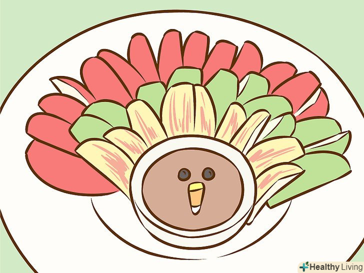 - Потім приготуйте соус для яблук. Змішайте 1 склянку йогурту, 1 столову ложку меду і 1 столову ложку арахісового масла у великій мисці. Налийте трохи соусу в соусницю. Поставте її в центр тарілки. розкладіть шматочки яблук навколо соусниці півколом - від лівого краю до правого. Шматочки яблук необхідно ставити на ребро, а не класти плазом. Викладайте їх таким чином, щоб м'якоть яблука чергувалася з червоною шкіркою. Ці скибочки виступають в ролі пір'я індички.