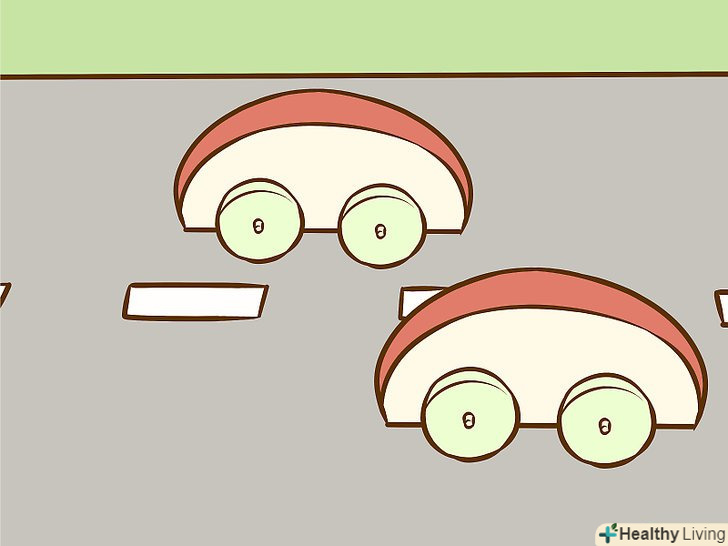 Створіть Гоночний автомобіль з яблука.щоб зробити з яблука корисний перекус у вигляді гоночного боліда, вам знадобляться шматочки яблука, виноград і зубочистки. Розріжте яблуко зверху вниз на п'ять або шість часточок. Зріжте вершину часточки яблука по вертикальній осі приблизно на сантиметр. Покладіть яблуко на тарілку або обробну дошку шкіркою вгору. Тепер шматочок яблука не буде падати.[8]- Проткніть підставу яблука двома зубочистками. При цьому зубочистки повинні стирчати по обидві сторони від шматочка яблука.
