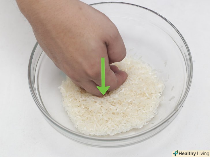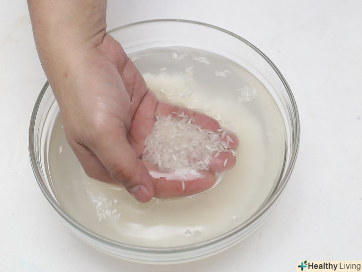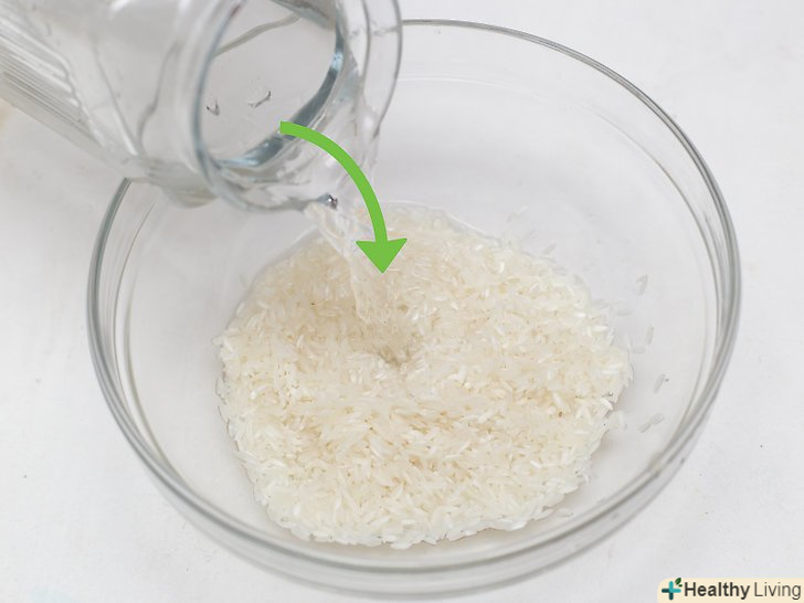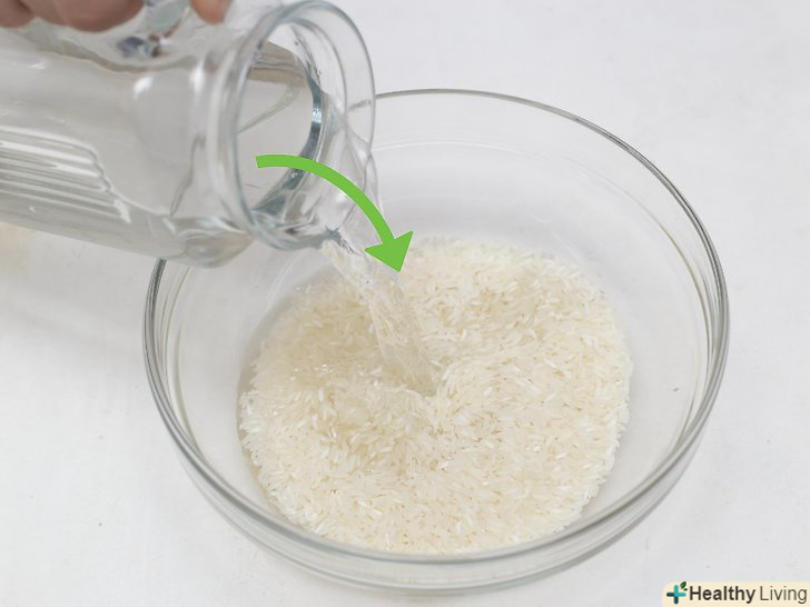 Залийте рис водою.налийте в миску з рисом воду з-під крана, щоб вона повністю покрила рис. Обсяг води повинен бути приблизно в три рази більше обсягу рису.