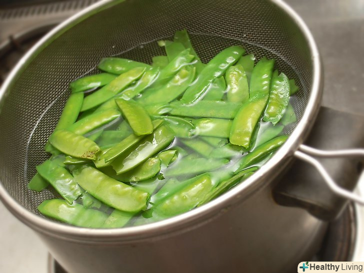 Помістіть стручки гороху в мусліновий / тканинний пакет або друшляк/кошик з дроту.занурте пакет або кошик у киплячу воду. Бланшуйте в наступному порядку:- 1 хвилина для снігового гороху