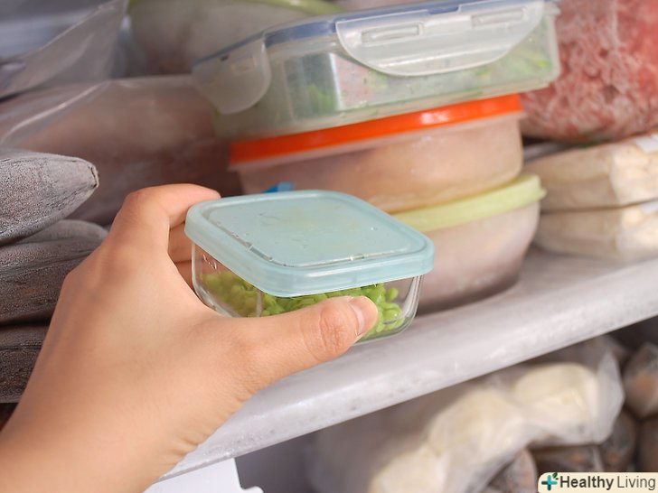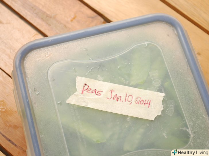 Цю частину потрібно зробити швидко.чим швидше горошок потрапить в морозилку, тим більше шансів, що він залишиться свіжим і цільним. Якщо він буде занадто довго перебувати при кімнатній температурі, то ризикує стати занадто м'яким. Помістіть бланшований горошок в пакети або відповідні контейнери для заморозки. Упакуйте його настільки щільно наскільки зможете, щоб максимально зменшити кількість повітря всередині упаковки. Залиште близько 1/2 дюйма/1.5 см вільного простору щоб компенсувати збільшення обсягу при заморожуванні.- Обережно натискайте, щоб видалити надлишок повітря з упаковки. Налив крижану воду на упаковку, можна видалити більше зайвого повітря.