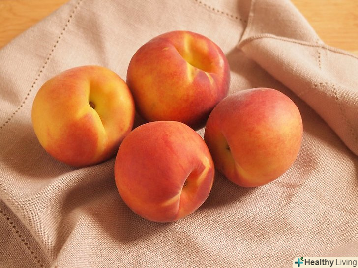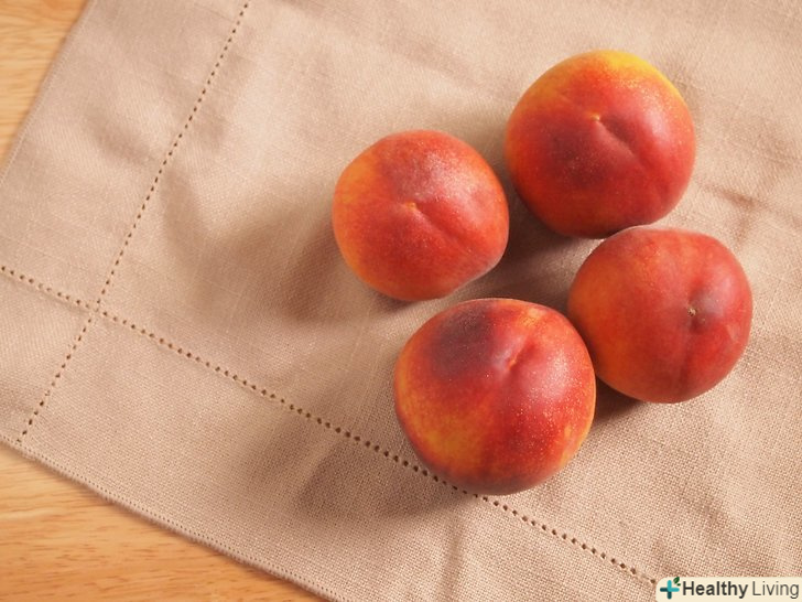 Розкладіть персики.розкладіть персики місцями кріплення живців вниз на лляній серветці. Відстань між персиками має бути однаковим, при цьому жодні з них не повинен стосуватися іншого персика (якщо звичайно у вас не море персиків).