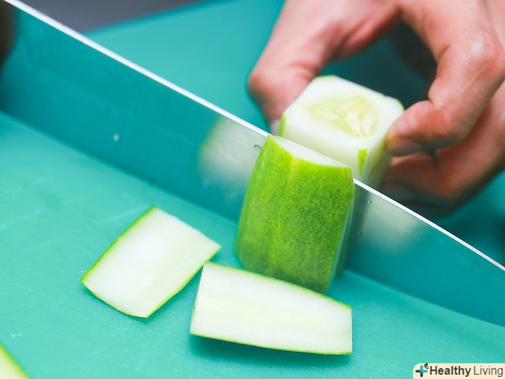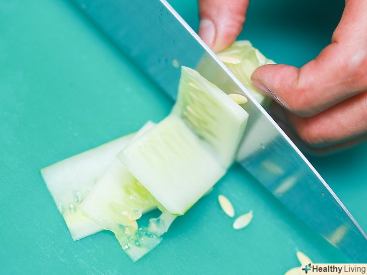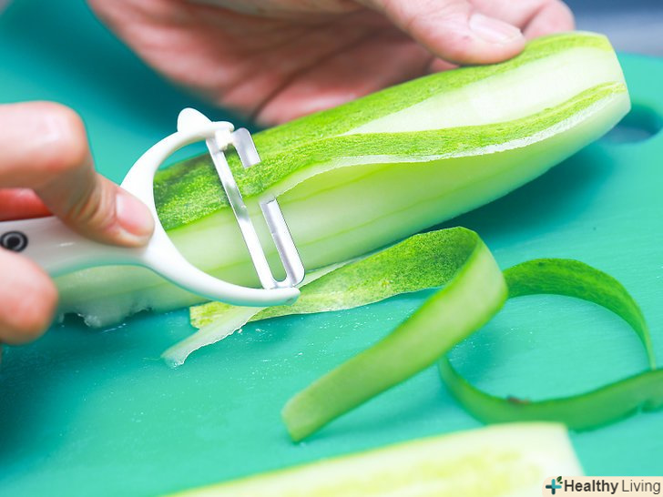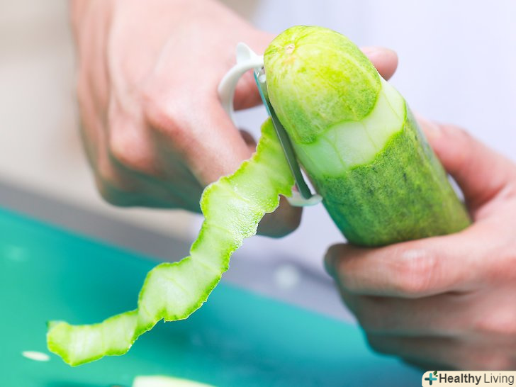 Зніміть шкірку з огірка (за бажанням).шкірка може бути жорсткою або гіркою, проте вона в будь-якому випадку їстівна. Якщо ви не хочете її їсти, візьміть ніж для овочів і зріжте шкірку тонкими смужками.