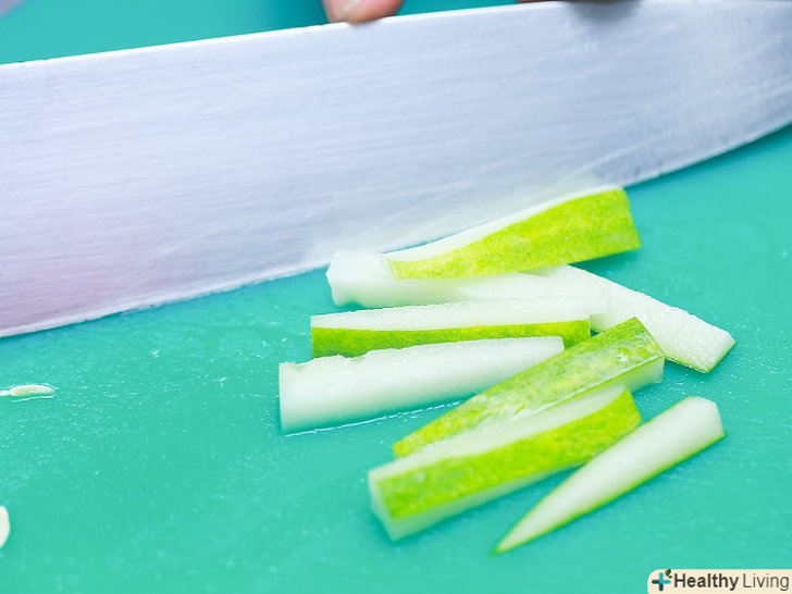 Наріжте огірок брусочками (за бажанням).це різновид нарізки соломкою, але шматочки виходять більш товстими.- Просто розділіть огірок на довгі шматки довжиною 6 см, а потім наріжте кожен з них у вигляді товстої соломки товщиною 6 мм. Зберіть ці скибочки в купку і потім розріжте уздовж по 6 мм на широкі палички.[6]