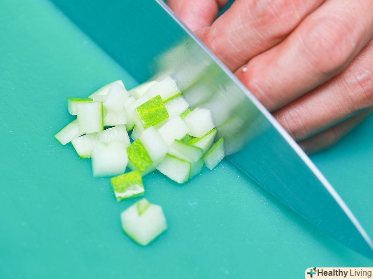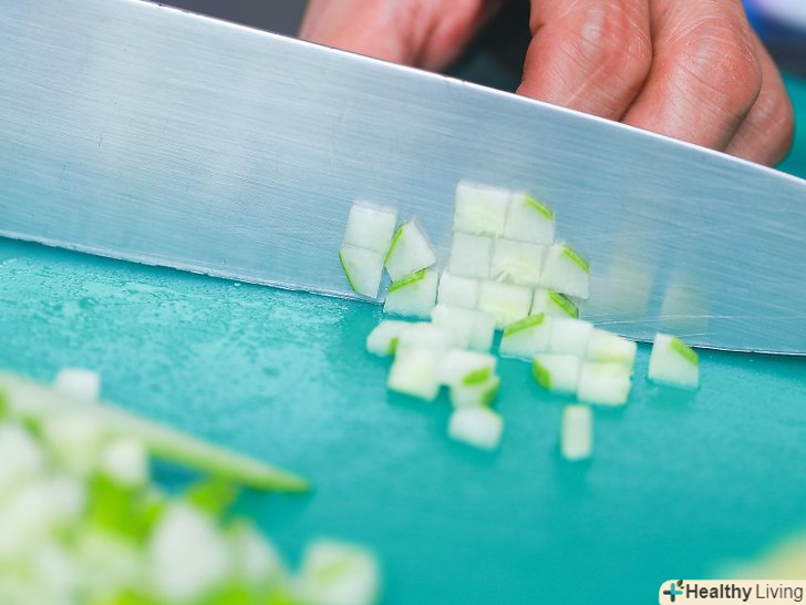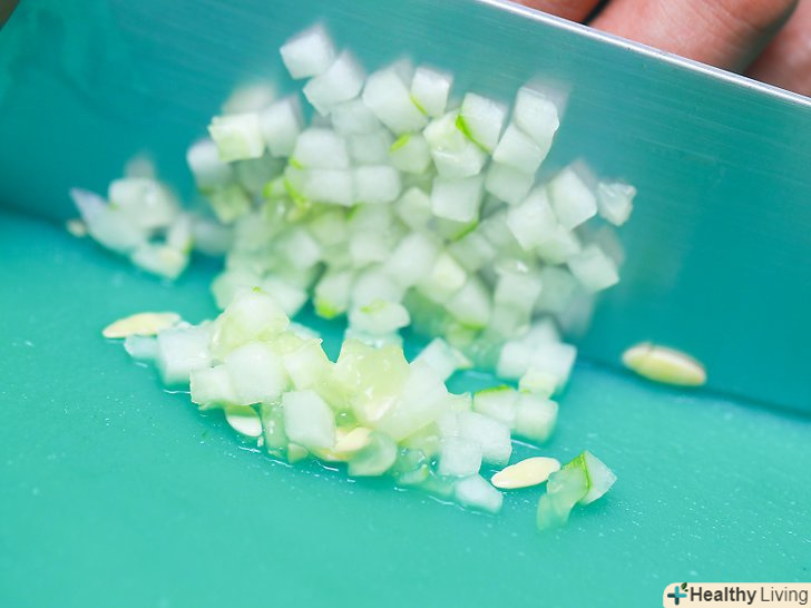 Наріжте огірки на зовсім дрібні кубики.по-французьки цей спосіб називається" брюнуаз " і вимагає всього лише одного додаткового дії до методу нарізки соломкою. Руками зберіть соломку в одну купку. Потім розріжте на однакові шматочки, що нагадують за своєю формою кубики. Це саме те, що треба!- Намагайтеся домогтися ідеальних розмірів близько 2 мм х 2 мм х 2 мм.