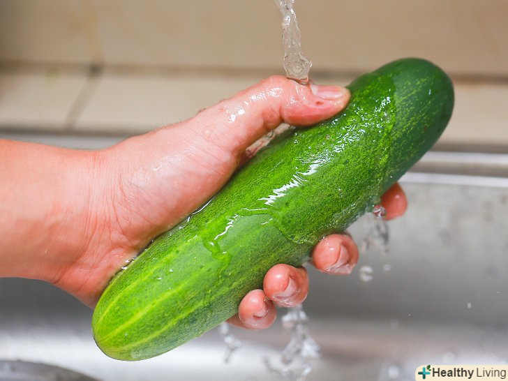 Вимийте огірки.помістіть необроблені воском огірки під холодну воду і трохи потріть їх. Це дуже важливо зробити, так як при цьому ви видаляєте з їх поверхні різні види бактерій, такі як кишкова паличка, сальмонела або золотистий стафілокок.- Співробітники санітарно-епідеміологічної служби[1] рекомендують використовувати спеціальні миючі засоби, які необхідно застосовувати разом з великою кількістю холодної або теплої водопровідної води; також необхідно використовувати щітку, якщо ви збираєтеся вживати в їжу неочищені овочі.