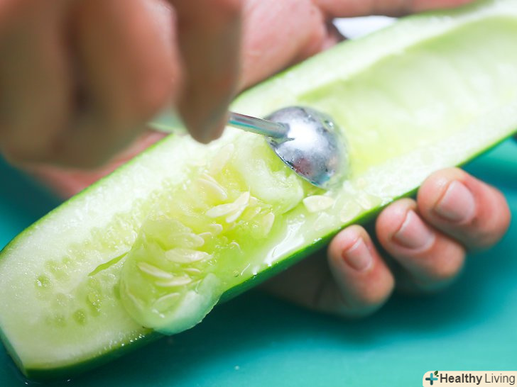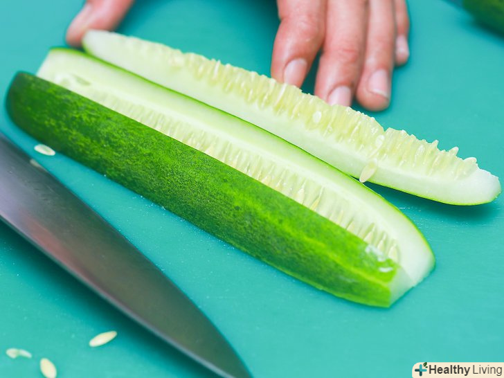 Видаліть насіння (за бажанням).насіння огірка в основному складаються з води, так що вони можуть зробити ваш салат водянистим або додати небажану рідину в приготовану страву. Визначтеся з тим, потрібні вони вам чи ні.- Можливо, Вам буде легше нарізати огірок без насіння.