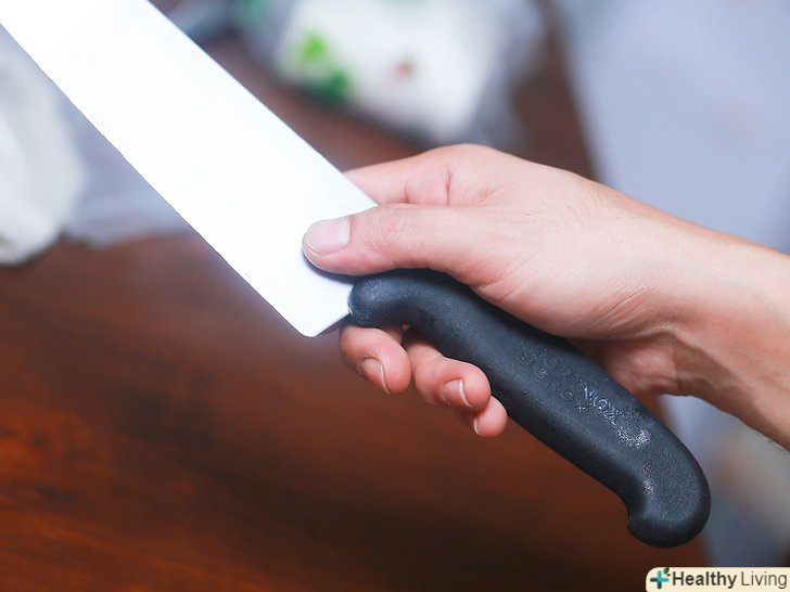 Правильно тримайте при цьому ніж.візьміться середнім, безіменним пальцями і мізинцем за рукоятку, а великий і вказівний розташуйте по сторонах леза, щоб мати можливість контролювати процес нарізки.[2]- Візьміть огірок другою рукою. Притримуйте його кінчиками пальців.