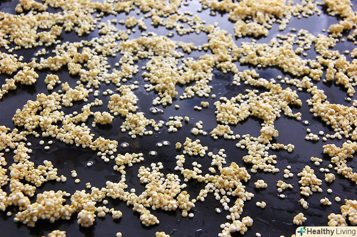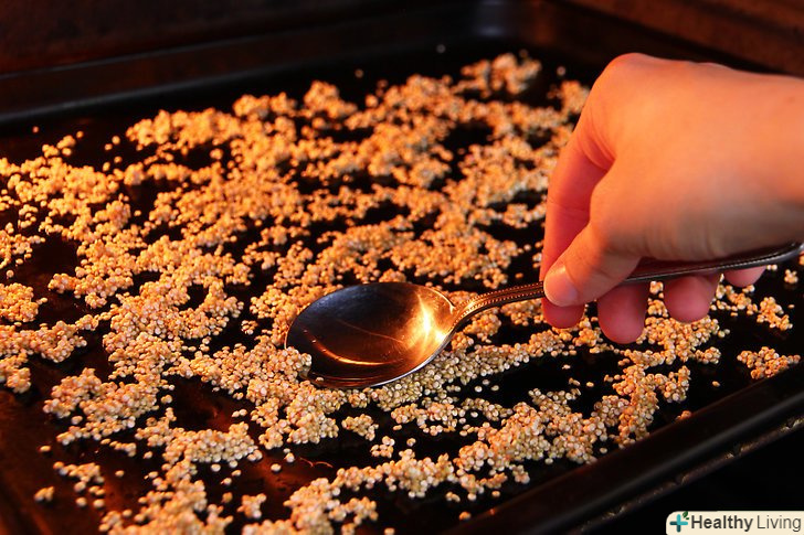 Візьміть деко і розкладіть на ньому помиту кіноа.поставте деко в духовку на найслабший вогонь, тримайте дверцята духовки прочиненими.