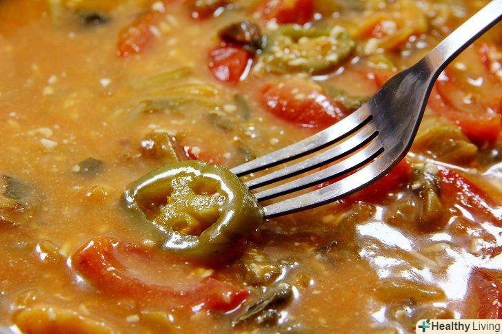 Якщо можна, дістаньте гостру приправу.деякі страви містять гостру приправу у вигляді досить великих скибочок або пластівців, які можна дістати. Навіть якщо приправа частково вбереться в інші інгредієнти, краще вийняти скибочки гострого перцю, щоб потім вони не потрапили вам в рот.[6]- Виймайте гостру приправу ложкою, виделкою або чимось іншим, щоб вона не потрапила на ваші пальці. Навіть після того як ви вимиєте руки, на них може залишитися гостре масло, яке здатне дратувати шкіру і очі.