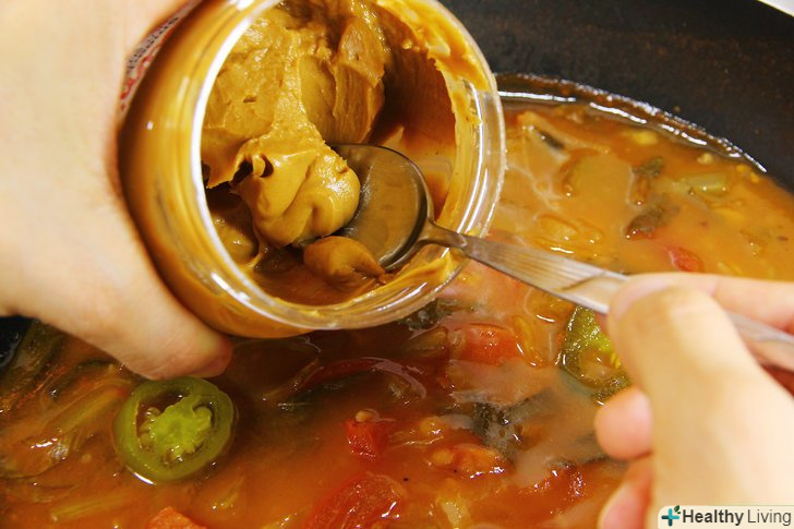 Підмішайте в блюдо горіхове молоко або масло.продукти з горіхів мають ніжний смак і допомагають зробити суп більш густим. Спробуйте додати трохи арахісової пасти в суп гамбо, щоб зробити його менш гострим і надати додатковий аромат. Арахісова паста добре поєднується і з азіатськими стравами, наприклад з пад-тай.- Багато людей погано переносять або не люблять молочні продукти, і в цьому випадку замість коров'ячого молока або вершків можна використовувати кокосове або мигдальне молоко. Подібним чином сир можна замінити арахісовим маслом або пастою з насіння Чіа.