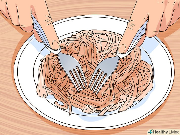 - Знову проколіть курятину другий виделкою і продовжуйте шматувати м'ясо. Якщо ви вже обірвали більшу частину або всю сторону фрагмента курятини, вийміть першу вилку, якою фіксуєте м'ясо на тарілці, і проткніть його в новому центрі залишився шматка, який ще належить подрібнити.