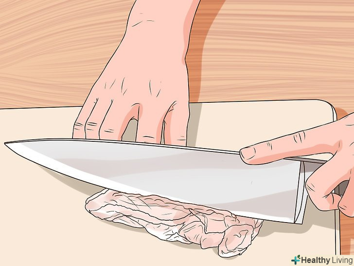 Обробіть м'ясо на дрібні шматочки.[15] на відміну від дроблення в комбайні, вам доведеться повозитися з куркою, щоб якісно подрібнити її. Нарвіть або наріжте м'ясо на шматочки, щоб при цьому довжина кожної з їх сторін становила не більше 2,5 см.- Як і в разі подрібнення в комбайні, м'ясо повинно бути без кісток.