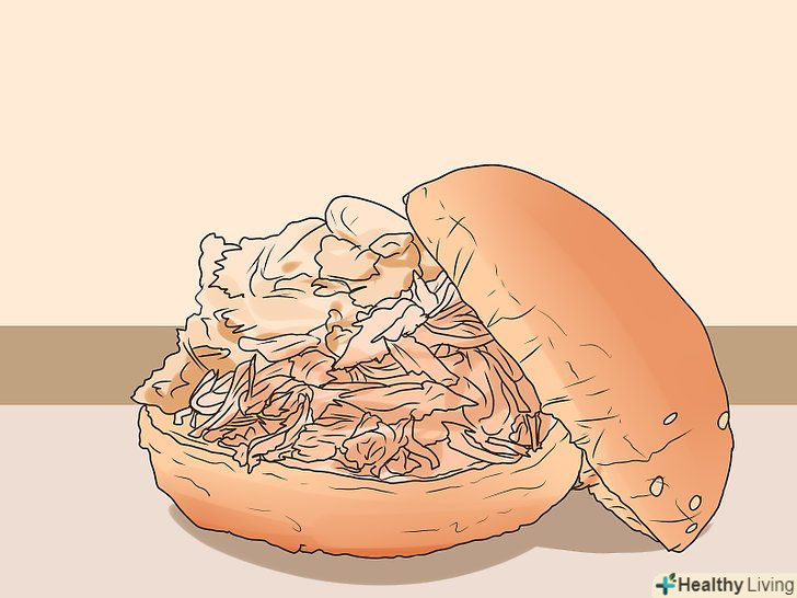 Приготуйте седвіч з курятиною, запеченою на барбекю.[13] змішайте в невеликій мисці чайну ложку соєвого соусу, чайну ложку вустерського соусу, ¾ чайної ложки яблучного оцту, ¼ чайної ложки пластівців червоного перцю, ¼ чайної ложки часникового порошку, 1/8 чайної ложки цибулевого порошку, 1/3 склянки кетчупу і чайну ложку коричневого цукру.- Перелийте соус в сковорідку середнього розміру і насипте туди ж 250 грам подрібненої курятини. Обсмажуйте на слабкому вогні протягом трьох-чотирьох хвилин, а потім зменшіть вогонь до мінімуму. Накрийте кришкою і готуйте 50-55 хвилин, періодично помішуючи вміст.
