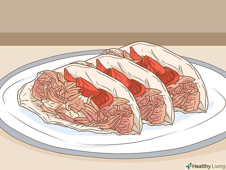Приготуйте тако з подрібненої курятини.[14] купуйте Мексиканські Кукурудзяні тортильї. Можна взяти як тверді, так і м'які коржі. Налийте дві чайні ложки рослинної олії в невелику сковороду з антипригарним покриттям і поставте її на середній вогонь. Насипте столову ложку нарізаної цибулі. Протушкувати пару хвилин. Потім додайте 450 грам подрібненої курятини, щіпку кмину, щіпку порошку чилі і ¼ склянки томатної пасти.- Змішайте всі компоненти разом і включіть сильний вогонь, щоб довести суміш до кипіння.
