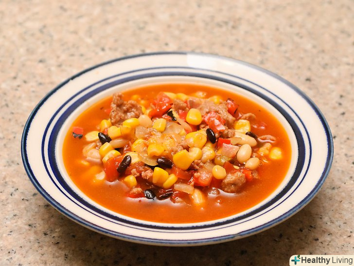 Приготуйте суп з квасолі.простий овочевий суп можна "оживити", якщо додати квасолі. Якщо ви готуєте суп на вечерю, то овочевий суп — це відмінний варіант, а найприємніше те, що ви зможете додавати найрізноманітніші інгредієнти. Простий квасолевий суп готують так:- Візьміть каструлю, в невеликій кількості оливкової олії підсмажте дрібно нарізану цибулю і часник. Додайте 1-2 дрібно нарізаних морквини і стакан різаного картоплі. Додайте 2-3 склянки курячого/овочевого бульйону або води і дайте покипіти. Додайте овочі, які у вас є: консервована, заморожена або свіжа стручкова квасоля, кукурудза, стакан квасолі. Приправте суп базиліком, посоліть і поперчіть за смаком.