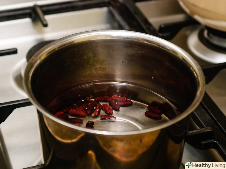 Замочіть сушену квасолю в холодній воді на 8-12 годин.сушену квасолю необхідно замочити у воді, а вже після цього варити і готувати її. Для найкращого результату замочуйте квасолю в досить великій кількості холодної води всю ніч при кімнатній температурі.[1]- Може бути корисним перед замочуванням відсортувати квасолю вручну, щоб прибрати будь-які погані квасолини або непотрібний сміття (якщо він є), а також промити її. Промити квасолю досить в друшляку під проточною холодною водою.