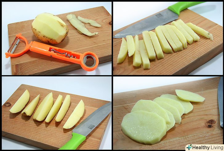 Почистіть і наріжте картоплю на чіпси у відповідність з наступними рекомендаціями:- Для картоплі фрі наріжте брусочки в довжину картоплі, шириною близько ½ см.