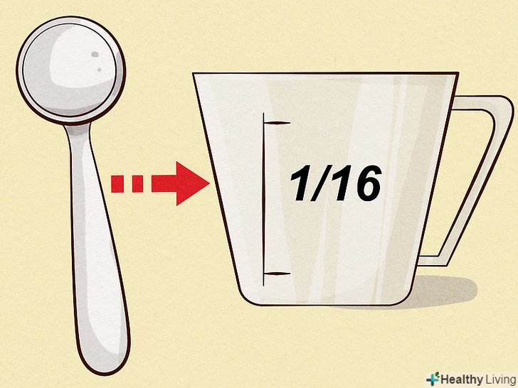 Відміряйте 1/16 гуртки. столова ложка дорівнює 1/16 гуртки. Знаючи це, ви легко можете відміряти дану кількість без мірної ложки. Найлегше відміряти 1/16 у великій мірної гуртку з чітко позначеними поділами. Якщо такої гуртки немає, то найкраще підійде маленька кухлик, рівна 1/8 великої гуртки. Відповідно, столова ложка буде приблизно дорівнює половині такої кухлика.[2]
