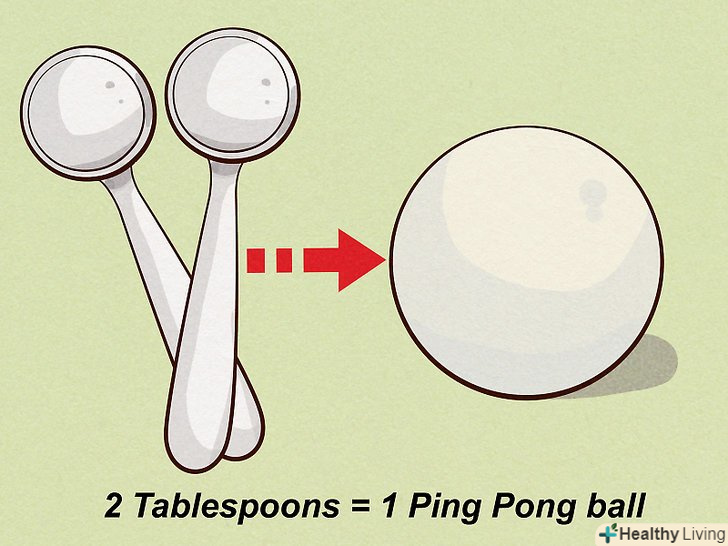 Запам'ятайте: 2 столові ложки приблизно відповідають розміру кульки для настільного тенісу.якщо ви хочете стежити за розмірами ваших порцій в ресторані, Вам стане в нагоді вміння візуально відрізняти столову ложку від інших столових приладів. Пам'ятайте, що звичайний кульку для настільного тенісу можна порівняти за розміром з двома столовими ложками. Відміряти столову ложку за допомогою рідини може виявитися не найзручнішим способом. Навпаки, використання предметів для порівняння може спростити це завдання.[5]