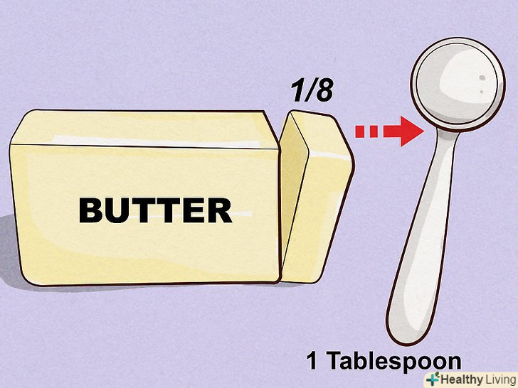 Запам'ятайте розмір порції їжі, що дорівнює обсягу однієї столової ложки.деякі продукти розфасовані по порціях. Можна порахувати, скільки таких порцій відповідає одній столовій ложці. Надалі ви зможете швидко відміряти потрібну кількість під час готування, випікання або підрахунку калорій. Наприклад, одна столова ложка цукру дорівнює трьом порційним пакетикам цукру або трьом кубикам цукру.[8]- Інший приклад: пачка масла відповідає за обсягом восьми столових ложок. Отже, 1/8 пачки масла буде дорівнює одній столовій ложці.