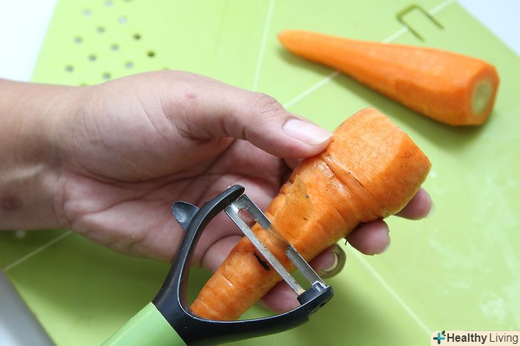 Помийте і очистіть овочі і фрукти.використовуйте скребок, щоб очистити плоди від шкірки, особливо якщо ці продукти не є органічними. Ретельно змивайте бруд і пісок. Якщо овочі або фрукти мають шкірку, використовуйте спеціальний ніж для чищення, щоб її зняти, тому що дітям важко їсти тверду шкірку.