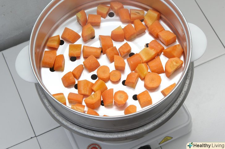 Приготуйте продукти на пару.покладіть продукти в кошик пароварки, налийте близько двох дюймів води в каструлю пароварки. Накрийте пароварку і поставте на плиту на нагрів вище середнього. Зніміть пароварку з вогню, коли шматочки овочів стануть м'якими, після 5-10 хвилин.- Скористайтеся чистою виделкою, щоб перевірити готовність продуктів.