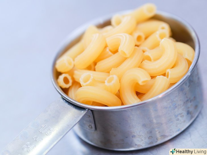 Використовуйте мірні склянки або кухонні ваги, щоб виміряти ріжки.якщо використовуєте кухонні ваги, насипте макарони в чашку, прикріплену до ваг, і відміряйте 55 грам. При використанні мірної склянки на 1 порцію (55 грам) необхідно ½ склянки сухих макаронних виробів.- 2 порції = 1 стакан; 4 порції = 2 склянки; 6 порцій = 3 склянки; 8 порцій = 4 склянки.
