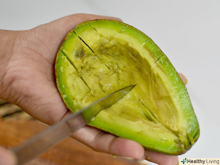 Зробіть насічки на м'якоті авокадо.використовуйте ніж для очищення овочів, щоб нарізати лінії на м'якоті. Наріжте серію з трьох або чотирьох паралельних ліній, що йдуть від верхньої до нижньої частини кожної половини. Наріжте інший набір ліній, перпендикулярних до першого.- Обріжте м'якоть до шкірки, але не ріжте шкірку.
