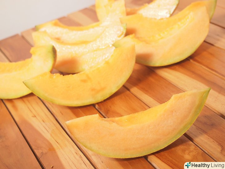 Поскребіть диню.помістіть диню під проточну воду і як слід поскребіть її поверхню щіткою для миття овочів. Таким чином ви видалите з неї бруд і шкідливих мікробів.[6]- Зріжте обидві верхівки.покладіть диню боком на обробну дошку. Притримуючи диню однією рукою, обріжте близько 1-2 сантиметрів з обох кінців, щоб видалити сліди від стебла. Крім того, після цього кінці стануть плоскими, і ви зможете покласти на них диню і легше обрізати шкірку.[7]