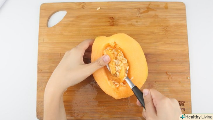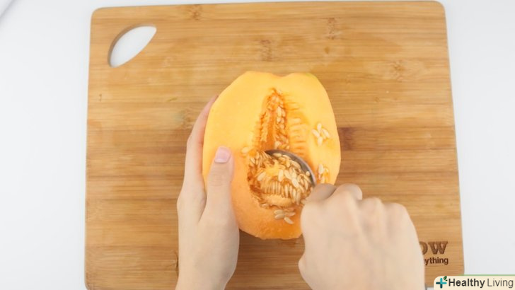 Дістаньте насіння.після того як ви позбудетеся від шкірки і зеленої м'якоті, розріжте диню навпіл. Розкладіть половинки дині м'якоттю вгору. Візьміть ложку і дістаньте насіння з середини кожної половинки. Постарайтеся видалити разом з насінням якомога менше помаранчевої м'якоті — в середині вона найбільш соковита і солодка.- Викиньте насіння у відро для сміття або очистіть їх від м'якоті і засмажте так само, як гарбузове насіння.[9]
