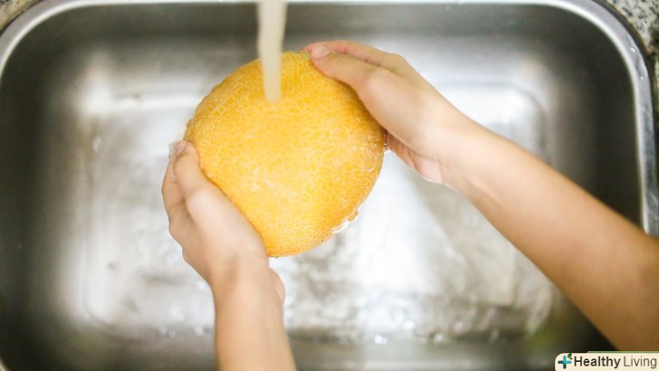 Вимийте і поскребіть диню.помістіть диню під проточну воду і як слід поскребіть її поверхню щіткою для миття овочів. Необхідно добре вимити диню: адже вона росла на землі, і на ній могли залишитися шкідливі мікроорганізми, наприклад сальмонела.- Немає необхідності мити всі фрукти і овочі милом або іншим миючим засобом, і деякі не рекомендують робити цього. Досить покласти диню під чисту проточну воду і гарненько пошкребти, щоб видалити з її поверхні бруд і мікробів.[1]