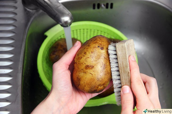 Розташуйте фрукти / овочі під краном.якщо у вас є якась щітка для чищення, ви можете використовувати її для деяких овочів/фруктів, таких як картопля, які росли в грунті. Просто переконайтеся, що щітка не надто жорстка, або вона буде врізатися в шкірку.