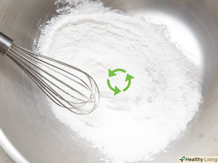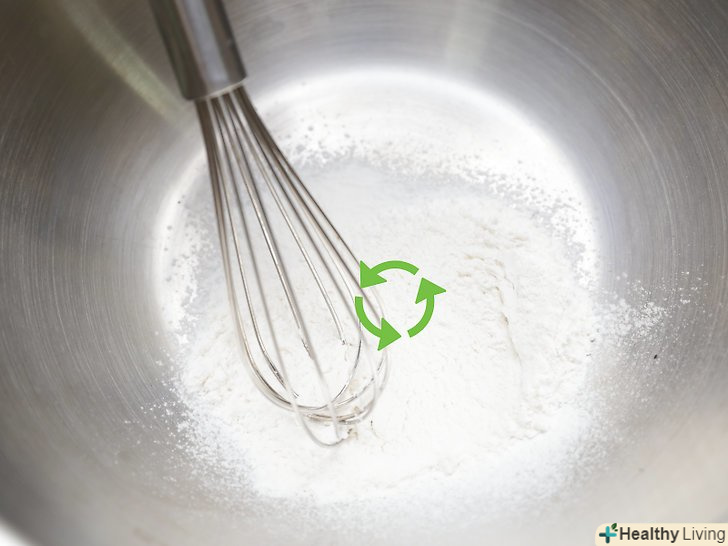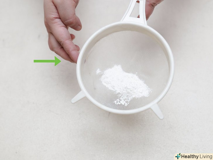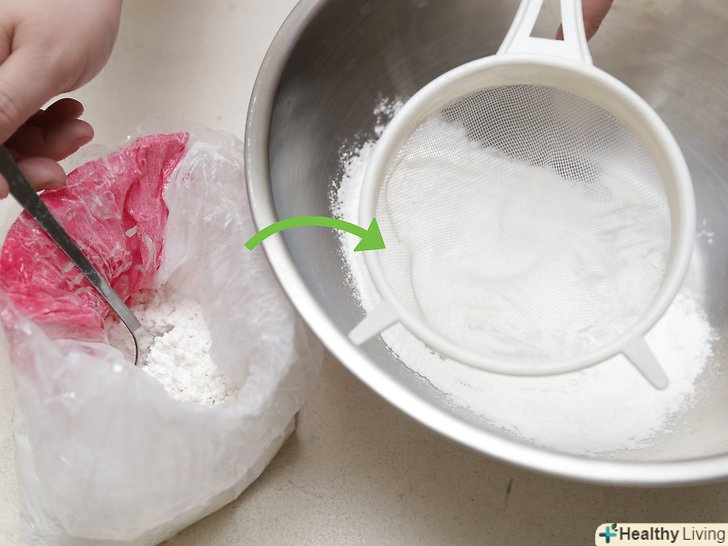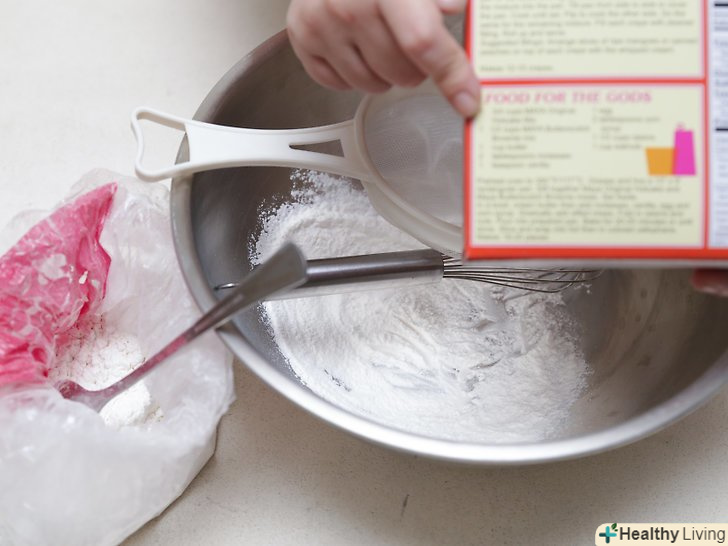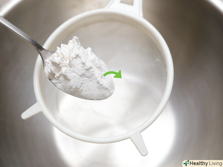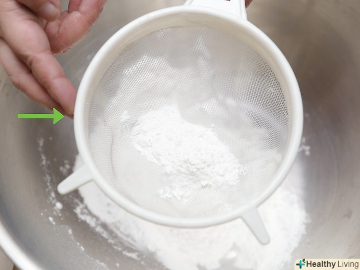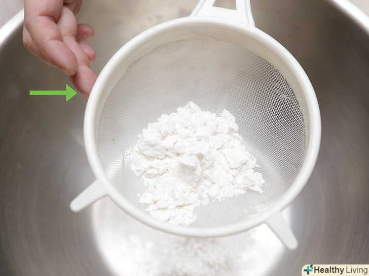 Просійте борошно, яка вже лежала в мішку деякий час.не потрібно просівати борошно кожен раз. Якщо борошно не лежала в мішку занадто довго, ви з чистою совістю зможете використовувати її в рецепті. Якщо ж борошно вже полежала деякий час, то це призвело до ущільнення, що вимагає попереднього просіювання.[9]- Особливо важливо просіяти борошно, якщо мішок знаходився в тісному шафці або на ньому лежав інший предмет.