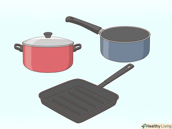 Купуйте каструлі та сковорідки.на полицях супермаркетів можна зустріти достаток каструль, сковорідок і пристосувань, покликаних полегшити роботу на кухні. Не звертайте на них уваги і купіть саме основне: каструлю, невеликий ківш з ручкою і сковорідку. Ці три пристосування можуть задовольнити практично будь-які потреби на кухні.[2]- Змінюйте набір відповідно до ваших потреб. Наприклад, якщо ви будете готувати їжу в невеликих кількостях, то замість каструлі і сковороди можна купити тільки високу сковорідку.