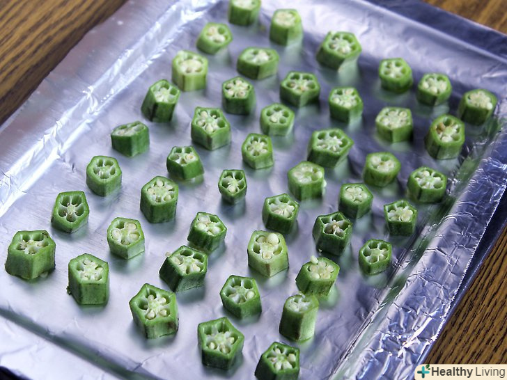 Покладіть бамію на деко.викладіть шматочки в один шар і переконайтеся, що жоден з них не торкається один одного.