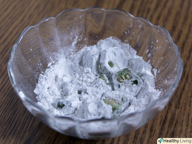 Паніруйте бамію.смажену Бамію зазвичай панірують в кукурудзяному борошні, або суміші кукурудзяного борошна і пшеничного. Досить обваляти бамію в звичайній кукурудзяному борошні або суміші, змішаної з дрібкою солі і дрібкою перцю. Незалежно від того яку суміш ви вибрали, обваляйте кожен шматок бамии в тонкому шарі панірування, і струсіть надлишки.- Однак, не використовуйте вологе тісто для панірування бамії перед заморожуванням, так як вона не буде триматися добре в морозильнику протягом довгого часу.