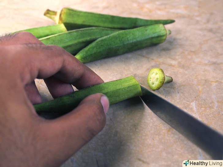 Обріжте стебла. Гострим ножем обріжте кінчики бамії. Не знімайте всю верхівку, що закриває осередок висівного диска; просто обріжте стебла. Оголення осередку висівного диска викличе швидку поломку бамии при бланшуванні її.