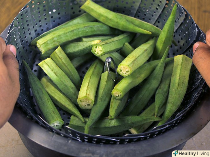 Вимийте бамію.змийте бруд і сміття потоком прохолодної води. Руками обережно очистіть бамію, масажуючи, змивайте бруд замість того, щоб терти її. Бамія-досить крихкий овоч і її легко пошкодити, якщо звертатися грубо.