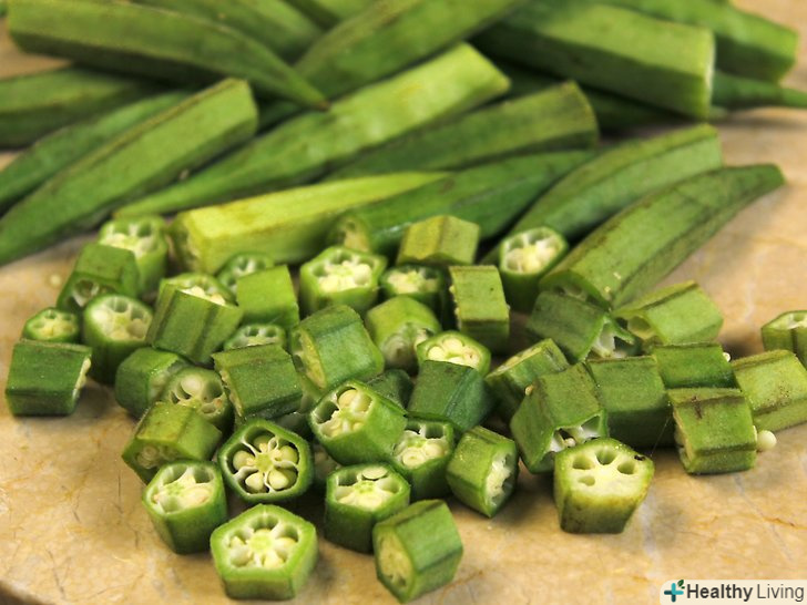 Покришите бамію на шматки.гострим ножем наріжте бамію на маленькі шматочки, які будуть смажитися рівномірно.