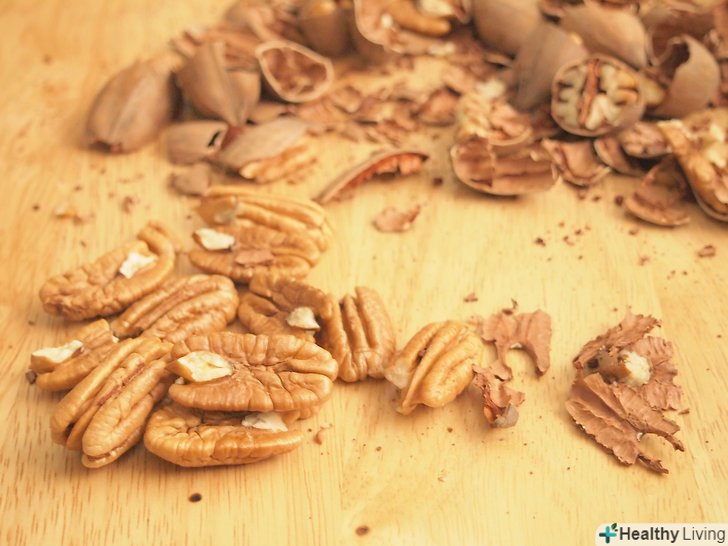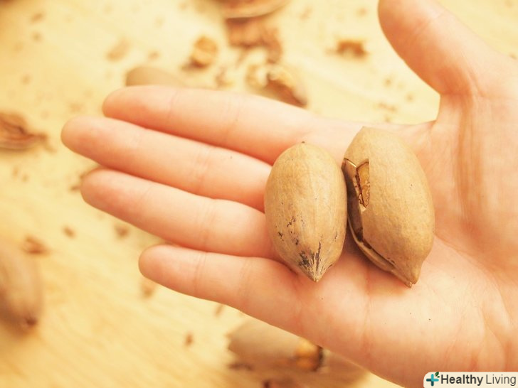 Переберіть пекани.переберіть пекани і викиньте горіхи з тріщинами або дірками в шкаралупі, а також ті горіхи, які на дотик здаються легше інших. Потрясіть горіх. Якщо він гримить, як брязкальце, значить, ядро всередині зіпсовано.